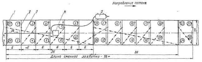 Рис. 13. Технологическая схема нарезки температурных швов в затвердевшем цементобетонном покрытии нарезчиком ДС-510 с алмазными дисками: 1 - шов расширения; 2 - поперечный шов сжатия; 3 - продольный шов; 4 - нарезчик швов ДС-510 (Д-903); 5 - цистерна с водой Стрелками обозначено направление движения нарезчика при нарезке швов (рабочий ход), а цифрами в кружках - последовательность нарезки; пунктиром обозначено направление движения нарезчика на транспортной скорости (холостой ход). Для нарезки паза швов расширения на одном из шпинделей устанавливают пакет карборундовых дисков, общая толщина которого равна ширине шва. Паз шва расширения может быть прорезан двумя алмазными дисками, раздвинутыми на ширину паза, и прокладкой между ними, фиксирующей положение дисков по ширине. Гребень после такой прорезки сбивается зубилом. При установке дисков на рабочем органе нарезчика проверяют точность их положения в одной плоскости и надежность закрепления. Для нарезки паза шва заданного сечения диски устанавливают по высоте, регулируя их положение датчиками глубины. При нарезке пазов швов алмазные диски рекомендуется охлаждать смазывающе-охлаждающей жидкостью СОЖ следующего состава: в 1 м3 воды растворяют 10 кг гудрона от хлопкового масла и 0,35 кг каустической соды. В качестве СОЖ можно также применять водно-мыльный раствор с содержанием стирального порошка «Лотос», «Кристалл», «Донбасс», «Мылолит» в количестве от 0,3 до 0,5%. Стиральный порошок вводят в расходную емкость с водой охлаждения на рабочей площадке. Применение СОЖ сокращает расход алмазных дисков и воды, позволяет увеличить производительность нарезчиков. Перед началом работы нарезчика размечают швы, прочерчивая их по рейке на бетонном покрытии. Линию шва можно отбить на поверхности свежеуложенного бетона тонкой проволокой (см. технологическую карту № 2, раздел II «Уплотнение бетонной смеси и отделка поверхности»). Нарезчик подключают к цистерне с водой емкостью 1 - 3 м3. Емкость устанавливают посередине участка работ на обочине или на краю покрытия. По мере передвижения нарезчика емкость с водой перемещают автомобилем или трактором. Нарезчик устанавливают на линию разметки шва так, чтобы указатели, расположенные на поворотном круге, совпали с линией разметки. Затем нарезчик поднимают на поворотном круге и при помощи выдвижной рукоятки разворачивают на такой угол, чтобы указатель продольной симметрии совпал с линией разметки шва. После этого нарезчик опускают на ходовые колеса и начинают нарезку шва, заглубляя диски и охлаждая их водой через форсунки. Нарезку шва начинают одновременным включением вращения дисков и их водяного охлаждения. Нажатием ножной педали рабочий орган опускают и диски заглубляют в бетон. С помощью регулятора скорости (дросселя гидродвигателя) включают минимальную подачу и постепенно увеличивают ее до оптимальной величины. Контроль за заглублением дисков ведется визуально по сегменту заглубления диска. При нарезке шва необходимо следить за охлаждением детское и при появлении пара или искр уменьшить скорость резания. Ориентировочно скорость подачи при нарезке алмазными дисками швов глубиной 5 см в бетоне на гранитном щебне и кварцевом песке должна составлять 0,5 - 0,7 м/мин. После того, как первая часть поперечного шва (1,5 - 2 м до края покрытия) нарезана, рабочий