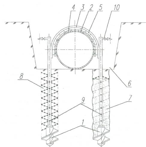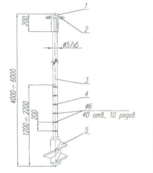 1 - сменный оголовок; 2 - штуцер; 3 - анкерная тяга в виде трубы; 4 - отверстия для инъекции вяжущего вещества в грунт; 5 - винтовой наконечник Рисунок 6 - Конструкция винтового анкерного устройства с повышенной удерживающей способностью. 8.45 Закачка производится с помощью плунжерных насосов (например ПС-4Б, НС-3, НД, ПС-4Б и т.д.), техническая характеристика плунжерного насоса ПС - 4Б приведена в приложении Н. Расход вяжущего вещества должен составлять 150...250 л на анкер. 8.46 Процесс закачки вяжущего продукта следует вести в следующем режиме: давление 0,5...1,5 МПа; время инъектирования 0,5...4 мин. 8.47 Сразу после окончания процесса инъектирования необходимо опорожнить внутреннюю полость анкера. Вытеснение вяжущего продукта из внутренней полости анкера производится с помощью компрессорной установки АКС - 8 (технические характеристики приведены в приложении Ж). 8.48 При проведении работ по закреплению грунта вяжущими продуктами необходимо следить за качеством выполнения операций и правил техники безопасности. 8.49 После устройства первого анкера производится устройство второго в аналогичной последовательности. 8.50 На трубопровод между внедренными анкерами (см. рисунки 1, 2) устанавливаются защитный коврик и футеровочный мат для защиты изоляционного покрытия трубопровода от повреждения силовым поясом. 8.51 Силовой пояс приваривается к анкер - инъекторам при помощи ручной электродуговой сварки (техническая характеристика сварочного агрегата АДД - 305 приведена в приложении И). Силовой пояс необходимо защитить от коррозии путем окраски его праймером или другими изоляционными покрытиями (техническая характеристика битумного котла ИСТ-ЗБ представлена в приложении М). 8.52 Основные показатели