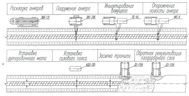 грунтов на глубину до 7.10 На основании работ, проведенных в п.4.9, должен быть выбран вид вяжущего продукта (см. приложение А и Б.). 7.11 Для корректировки расчетных проектных параметров (несущей способности, расстояния между анкерными устройствами) необходимо произвести закрепление контрольного анкера с последующим его подъемом, определением удерживающей способности и сравнением результатов испытаний с расчетными данными. 8 ТЕХНОЛОГИЯ ЗАКРЕПЛЕНИЯ ТРУБОПРОВОДОВ ВАУ С ПОВЫШЕННОЙ УДЕРЖИВАЮЩЕЙ СПОСОБНОСТЬЮ8.1 Работы по завинчиванию анкерных устройств должны выполняться согласно ВСН 007-88. Состав бригады, машин и механизмов представлены в таблице 2. 8.2 Работы необходимо производить при наименьшем уровне грунтовых вод. 8.3 При большой обводненности траншеи её необходимо осушить при помощи водоотливной установки АВ-701А (технические характеристики приведены в приложении Д). При проведении этих работ в зимнее время необходимо проверить возможность сброса воды (до её замерзания) по отводным каналам. В качестве запасного варианта может быть предложено погружение трубопровода на проектные отметки с помощью инвентарных утяжелителей. 8.4 В подготовительные работы, выполненные в условиях ремонтно-механических мастерских, входят следующие процессы [18]: • изготовление защитных ковриков; • изготовление футеровочных матов; • сборка и сварка инъекционных анкеров с анкерными тягами. Таблица 2 - Состав бригады для производства работ по закреплению трубопровода инъекционными анкерами и потребность в машинах и механизмах