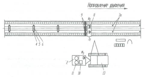 1 - траншея; 2 - сани металлические; За - анкеры, завинченные в грунт; 4 - мат футеровочный 5 - пояс силовой, соединительный; 6 - коврик защитный; 7 - трубопровод; 8 - мостик переходной; 9 - лестница; 10 - сварочный агрегат 11 - электротермос; 12 - кран-трубоукладчик; ◑ - рабочее место исполнителя. Исполнители: М3 - машинист крана-трубоукладчика; Э2 - электросварщик; И2 изолировщик Рисунок 7 - Схема организации работ и рабочих мест при монтаже и сварке силового пояса с анкерными тягами 8.55 Закрепленный трубопровод засыпается минеральным грунтом при помощи бульдозера. 8.56 Рекультивация плодородного слоя осуществляется при помощи бульдозеров. 8.57 Для повышения надежности эксплуатации трубопроводов на обводненных участках с использованием ВАУ с повышенной удерживающей способностью рекомендуется производить комплексную балластировку с чередованием установки железобетонных пригрузов.