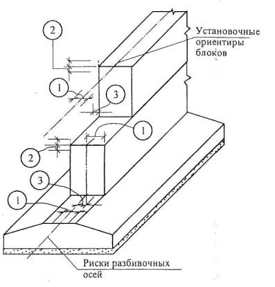 совмещения установочных ориентиров фундаментных блоков с рисками разбивочных