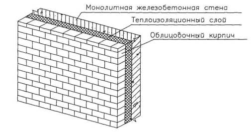 2006 Содержание Технологическая карта на облицовку фасада монолитных железобетонных зданий кирпичом с применением утеплителя содержит решения по организации и производству облицовочных работ с целью обеспечения их качества, снижения материальных и трудовых затрат, повышения тепловой защиты зданий и сооружений. В технологической карте приведены область применения, организация и технология строительного процесса, требования к качеству и приемке работ, техника безопасности и охраны труда, экологическая и пожарная безопасность, потребность в материально-технических ресурсах, технико-экономические показатели. Технологическая карта предназначена для инженерно-технических работников строительных и проектных организаций, а также производителей работ, мастеров и бригадиров, связанных с производством и контролем качества облицовочных работ. Технологическую карту в 2001 году разработали: к.т.н. Филипенко Н.Н. - руководитель работы; Покровская Е.В. - исполнитель; Ярымов Ю.А.- нормоконтроль; к.т.н. Шахпаронов В.В. - научно-методическое руководство и редактирование; к.т.н. Едличка С.Ю. - общее руководство разработкой комплекта технологических карт. Технологическая карта в 2006 году откорректирована Стронгиным М.И., Палиевской Д.С. под руководством Сусова В.И. 1 ОБЛАСТЬ ПРИМЕНЕНИЯ1.1 Технологическая карта разработана на облицовку фасадов монолитных железобетонных зданий кирпичом с устройством промежуточного слоя из плитного утеплителя при строительстве жилых, гражданских и общественных зданий. 1.2 Карта предназначена для производства наружных облицовочных работ с применением кирпичей или камней керамических лицевых и теплоизоляционных материалов в виде плит, образующих промежуточный слой между облицовкой и стеной из монолитного железобетона (рисунок 1).