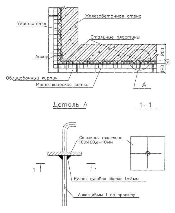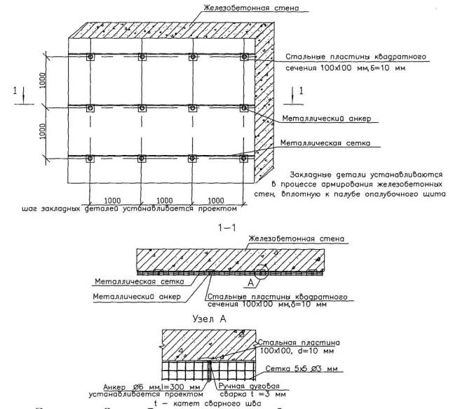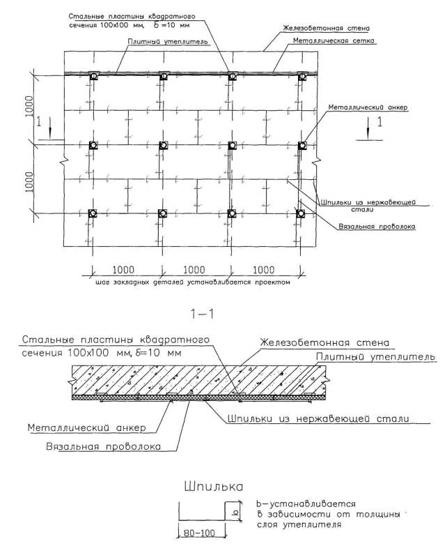 Рисунок 2 - Схема расстановки закладных деталей, устройства металлических анкеров 2.9 Общая толщина наружной стены и толщина теплоизоляционного слоя определяется теплотехническим расчетом, в соответствии с требованиями СНиП 23-02-2003 «Тепловая защита зданий», в зависимости от вида бетона (тяжелый, легкий, ячеистый), вида теплоизоляционного материала (минераловатные плиты, пенопласты и т.д.), вида керамических камней (сплошные, с пустотами), а также региона строительства и устанавливается проектной организацией. 2.10 Облицовка стен из монолитного железобетона состоит из следующих технологических операций: - сварка анкеров с пластинами закладных деталей и установка металлических сеток; - установка теплоизоляционных плит с креплением их между собой специальными шпильками и вязальной проволокой; - кладка наружных стен из облицовочного кирпича толщиной 120 мм. 2.11 Приварка анкеров к металлическим пластинам осуществляется ручной дуговой сваркой в следующей технологической последовательности: очистка закладных деталей от наплывов бетона и ржавчины стальной щеткой, сварка швов, очистка шва от шлака, осмотр и измерение шва. После сварочных работ должны быть выполнены мероприятия по защите металла от коррозии. 2.12 Установку металлических сеток или гладких стержней диаметром не более 6 мм в количестве не менее двух осуществляют с помощью вязальной проволоки, соединяющей анкера с сеткой или стержнями. Диаметр поперечных стержней в металлических сетках должен быть не более 3 мм. 2.13 Установка теплоизоляционных плит производится после окончания сварочных работ полосами, высота которых определяется расстоянием по вертикали между горизонтальными металлическими сетками. Плиты устанавливаются вразбежку. Крепление плит осуществляют с помощью вязальной проволоки и специальных металлических шпилек из нержавеющей стали (рисунок 3).