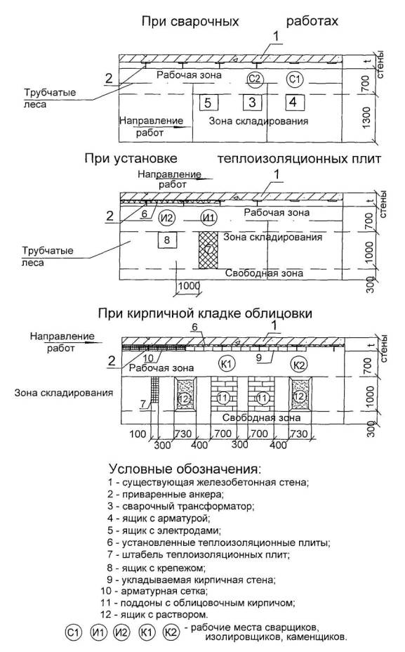 Рисунок 5 - Конструктивное решение облицовки оконных проемов 2.19 Организация рабочих мест сварщиков, изолировщиков, каменщиков при производстве сварочных работ, установке теплоизоляционных плит и кирпичной кладке должна соответствовать рекомендуемым ниже схемам (рисунок 6).