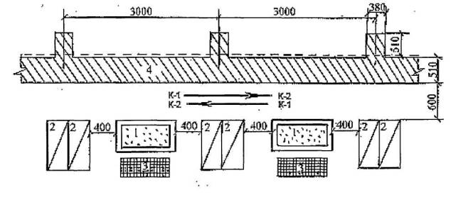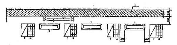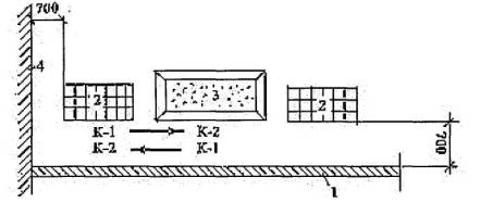 Условные обозначения: 5.2 Подача и раскладка кирпича для кладки тычковых рядов Кирпич подают в пакетах на поддонах. Для кладки наружной версты каменщики К-1, К-2 раскладывают кирпич на внутренней половине стены (поз. 1), для внутренней - на наружной (поз. 2). Каменщики К-1 и К-2 раскладывают кирпич перпендикулярно оси стены или под углом 45° к ней стопками по два кирпича с расстоянием между ними в полкирпича.