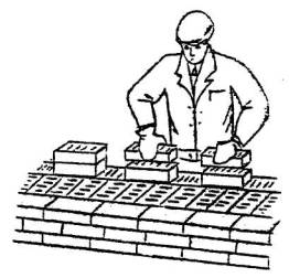 4.4 Приемы труда 1 Подача и раскладка керамического кирпича, перемешивание, подача и разравнивание раствора для кладки наружной версты. Каменщик К-2 раскладывает кирпичи после его подачи на внутренней половине стены: - для кладки ложковых рядов - стопками по два кирпича параллельно оси стены или под углом 45° к ней с расстоянием между стопками в один кирпич; - для кладки тычковых рядов - стопками по два кирпича перпендикулярно оси стены с расстоянием между стопками в полкирпича или под углом 45° к оси стены.