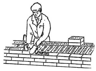 5.2 Раскладка кирпича Каменщик К-2 ведет раскладку кирпича параллельно оси перегородки, отступая от ранее выложенной кладки на 50-60 см, чтобы иметь место для разравнивания раствора. Каменщик следит за тем, чтобы лицевая сторона кирпича не имела повреждений и отколов.