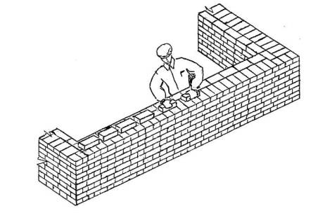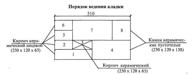 3 Подготовка процесса и условия его выполнения 3.1 До начала трудового процесса необходимо: - убрать мусор и посторонние предметы с рабочего места; - проверить уровнем горизонтальность основания под стену; - разбить фронт работ на захватки и делянки; - нанести осевые риски для кладки стены; - установить при необходимости средства подмащивания; - расположить материал, инструмент, приспособления и инвентарь согласно схеме организации рабочего места. 3.2 Работы следует выполнять, соблюдая требования охраны труда в соответствии со СНиП 12-03-2001, СНиП 12-04-2002, правил производства и приемки работ согласно СНиП 12-01-2004. 4 Технология и организация процесса 4.1 Кладку армированных стен средней сложности толщиной 51 см из пустотелых керамических камней с облицовкой керамическим кирпичом выполняет звено «двойка» - каменщик 4 разряда и каменщик 3 разряда. Кладку начинают с закрепления порядовок, которые устанавливают по отвесу и уровню или по нивелиру на расстоянии 10-15 м друг от друга. С помощью порядовок выкладывают маяки в виде убежной штрабы. Укрепляют причалку у маяков с помощью скобы. Чтобы причалка не провисала между маяками, под шнур подкладывают маячный клин, толщина которого равна высоте ряда кладки. Затем с помощью шаблона производится разбивка проемов согласно проекту. Кладка наружной версты ведется по многорядной (трехрядной) системе перевязки. Забутка и внутренняя верста выкладывается способом «вприжим». Кладку ведут порядно согласно нижеприведенной схеме. Выкладывается тычковый и ложковый ряды наружной версты, делается забутка по тычковому ряду, выкладывается тычковый ряд внутренней версты. Затем кладется два ложковых ряда наружной версты из облицовочного кирпича, тычковый ряд забутки и ложковый ряд внутренней версты из пустотелого камня.