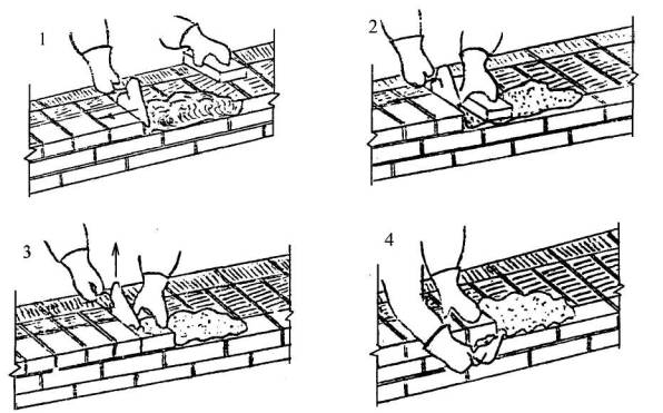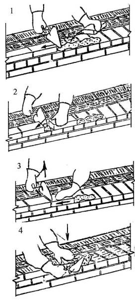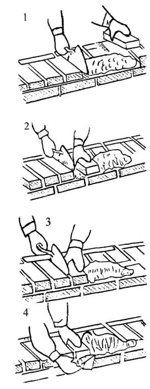 5.1 Кладка наружной версты. А. Кладка ложкового ряда наружной версты. Кладка ведется способом «вприжим». Держа в правой руке кельму, каменщик К-1 разравнивает ею растворную постель, затем ребром кельмы подгребает часть раствора и прижимает его к вертикальной грани ранее уложенного кирпича, а левой рукой подносит новый кирпич к месту укладки (поз. 1). После этого кладет кирпич на подготовленную постель и, двигая его левой рукой к ранее уложенному, прижимает к полотну кельмы (поз. 2 ). Движением правой руки вверх каменщик вынимает кельму, а кирпичом, перемещаемым левой рукой, зажимает раствор между вертикальными гранями укладываемого и ранее уложенного кирпича (поз. 3). Легким постукиванием ребром кельмы осаживает уложенный кирпич на растворной постели. Избыток раствора, выжатый из шва на лицевую поверхность кладки, каменщик К-1 подрезает кельмой за один прием после укладки двух кирпичей (поз. 4).