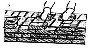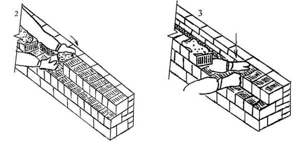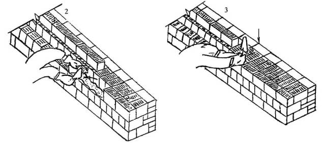 Каменщик К-1 разравнивает раствор кельмой, затем он берет обеими руками за торцовые грани камня и подносит его к месту укладки, постепенно поворачивая его так, чтобы его грань с раствором заняла вертикальное положение (поз. 2). Чтобы раствор не сползал, окончательный поворот камня каменщик К-1 осуществляет в момент осаживания камня на постель. Укладывая камень на место, каменщик передвигает левую руку вверх по тычковой грани, затем он плотно прижимает укладываемый камень к ранее уложенным (поз. 3) и осаживает его нажимом руки.