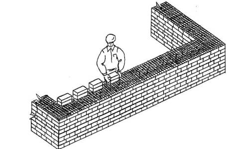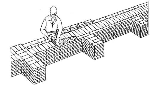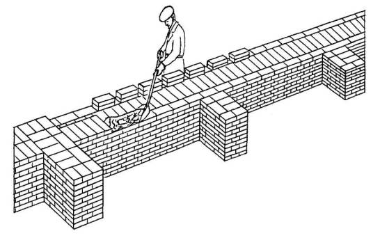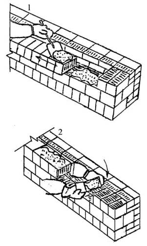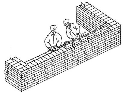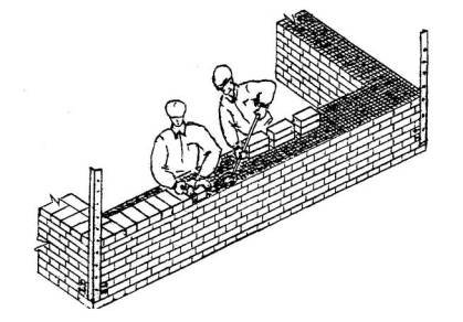 3 Подача и раскладка семищелевых керамических камней, перемешивание, подача и разравнивание раствора для кладки забутки Для кладки забутки: а) тычками - каменщик К-2 раскладывает камни насухо по внутренней версте стены вплотную один к другому, перпендикулярно оси стены, затем лопатой разравнивает грядку раствора между наружной и внутренней верстами, другую грядку раствора разравнивает на внутренней версте; б) ложками - каменщик К-2 раскладывает камни ложками на внутренней половине стены, раскладывая их щелями вверх, параллельно оси стены и разравнивает грядку раствора на стене под забутку.