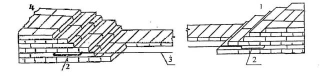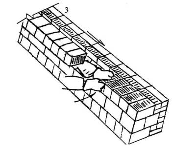 5.5 Подача и раскладка кирпича для кладки ложковых рядов Для кладки наружной версты и забутки кирпич раскладывают на внутренней половине стены (поз. 1, 2), для внутренней - на наружной (поз. 3). При кладке наружной и внутренней версты каменщик К-2 раскладывает кирпич параллельно стене или под углом 45° к ней стопками по 2 кирпича с расстоянием между ними в один кирпич (поз. 1, 3). Для кладки забутки каменщик К-2 раскладывает кирпич перпендикулярно оси стены или под углом 45° к ней стопками по два кирпича с расстоянием между ними в полкирпича (поз. 2).