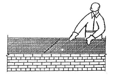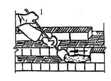 5.2 Распределение раствора и кладка тычкового ряда наружной версты Каменщик К-2 совковой лопатой подает раствор и распределяет его грядкой на длину 80-100 см, отступив 1,5-2 см от края стены. Каменщик К-1 разравнивает растворную постель кельмой на длину 40-50 см, подгребает часть раствора к ложковой грани ранее уложенного кирпича и, прижимая укладываемый кирпич к полотну кельмы, вынимает ее, осаживает кирпич нажимом руки. Избыток раствора подрезает кельмой и сбрасывает на кладку.