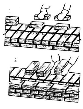 5 Приемы труда 5.1 Раскладка кирпича для наружной версты тычкового ряда. Каменщик К-2 берет кирпичи из поддона и стопками по два кирпича раскладывает их на внутреннюю версту стенки.