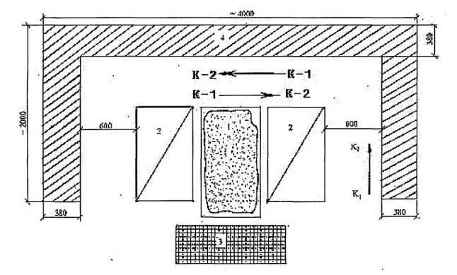 5.3 Кладка внутренней версты А Кладка тычкового ряда Каменщик К-2 подает раствор на стену под внутреннюю версту и на разложенные камни (поз. 1).