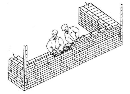 3 Подготовка процесса и условия его выполнения 3.1 До начала трудового процесса необходимо: - освободить рабочее место от мусора и посторонних предметов; - сделать осевую разбивку перегородки; - проверить горизонтальность основания под перегородку уровнем; - подать и расставить поддоны с кирпичом, ящики с раствором; - расположить инструменты и приспособления согласно схеме организации рабочего места; - подготовить подмости для кладки второго и третьего яруса. 3.2 Работы следует выполнять, соблюдая требования охраны труда согласно СНиП 12-03-2001 и СНиП 12-04-2002 и правила производства и приемки работ согласно СНиП 12-01-2004. 4 Технология и организация процесса 4.1 Кирпичную кладку перегородки выполняет звено «двойка» - каменщик 4 разряда и каменщик 2 разряда. Кладка ведется способом «вприжим» по однорядной цепной системе перевязки. Расшивка швов производится с одной стороны, сначала вертикальных, затем горизонтальных швов с одновременной протиркой ветошью. 4.2 Операции по кладке глухих перегородок из лицевого керамического кирпича размером 250´120´65 мм с расшивкой швов с одной стороны выполняется в следующем порядке: - установка порядовки и натягивание шнура-причалки; - подача и раскладка кирпича; - перемешивание, подача и разравнивание раствора; - кладка перегородки; - проверка качества выполняемой кладки; - расшивка швов с протиркой. 4.3 Организация рабочего места