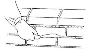 Держа в правой руке кельму, каменщик К-1 разравнивает ею растворную постель, затем ребром кельмы подгребает часть раствора и прижимает его к вертикальной грани ранее уложенного кирпича, а левой рукой подает новый кирпич к месту укладки. После этого кладет кирпич на подготовленную постель и, двигая его левой рукой к ранее уложенному кирпичу, прижимает к полотну кельмы. Движением вверх правой руки вынимает кельму, а кирпичом, придвигаемым левой рукой, зажимает раствор между вертикальными гранями укладываемого и ранее уложенного кирпича. Нажимом руки осаживает уложенный кирпич на растворной постели. Избыток раствора, выжатый из шва на лицо кладки, подрезает кельмой за один прием после укладки ложками двух кирпичей; подрезанный раствор каменщик К-2 набрасывает на растворную постель. 5.4 Расшивка швов После того, как каменщик К-1 выложит 2 ряда кладки, каменщик К-2 приступает к расшивке сначала вертикальных, а затем горизонтальных швов с наружной стороны, одновременно протирая поверхность перегородки ветошью.
