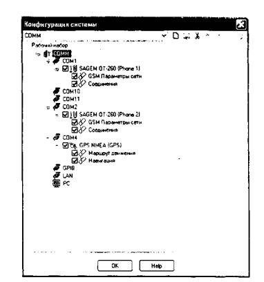 Рис. 1 ■ убедиться, что уровень сигнала, принимаемый по обоим тестовым терминалам не менее минус 85 dBm. Уровень сигнала отображается в окне «GSM Информация о сети» в строке "RXLevel". Если его значение меньше минус 85 dBm, то необходимо изменить место расположения Корунда или воспользоваться внешними антеннами; ■ нажать пиктограмму "Стоп" панели "Измерения". 8.2 Настройка программы Корунд В зависимости от комплектации Корунда, возможны различные варианты настройки рабочего набора. При комплектации Корунда двумя тестовыми терминалами первый тестовый терминал (Phone 1) производит исходящие вызовы на второй (Phone 2), а при комплектации четырьмя тестовыми терминалами, дополнительно, тестовый терминал 3 (Phone 3) производит исходящие вызовы на терминал 4 (Phone 4). Для проведения поверки необходимо провести настройку рабочего набора программы Корунд. Для этого необходимо проследовать в меню программы "Сервис"→ "Конфигурация" (см. рис.2). Двойным щелчком вызвать диалоговое окно "Соединения".