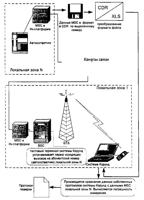 Рис.5 Схема организации дистанционной поверки коммутаторов стандарта GSM MSC и IN-платформ представлена на рис.6. Дистанционной поверкой называется поверка, когда поверитель и Корунд находятся в отличной от поверяемого MSC и IN-платформы локальной зоне. Для проведения измерений поверитель должен связаться с оператором MSC и/или IN-платформ и договориться о времени, порядке проведения измерений и о подключении автоответчика на выделенный абонентский номер. При дистанционной поверке (в соответствии с рис.6) Корунд производит серию исходящих вызовов на выделенный абонентский номер, подключенный непосредственно к MSC удаленной локальной зоны N. В СИДС MSC и/или IN-платформ должны обязательно регистрироваться данные о входящих вызовах (дата, время, длительность соединения) в формате CDR на выделенный абонентский номер. Без данных о входящих вызовах осуществление дистанционной поверки НЕВОЗМОЖНО. По окончании процесса измерений оператор MSC и/или IN-платформ должен произвести выборку данных по соединениям на выделенный номер, файл полученных данных о входящих вызовах передать поверителю (электронная почта, локальная сеть и т.д.). Далее поверитель преобразует полученный CDR файл в формат Excel программным конвертором Корунда. Остальные действия необходимо проводить в соответствии с п. 9.2 настоящей методики.