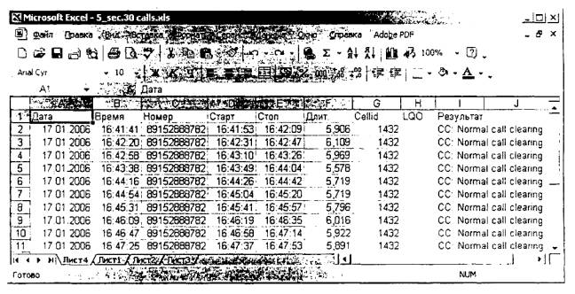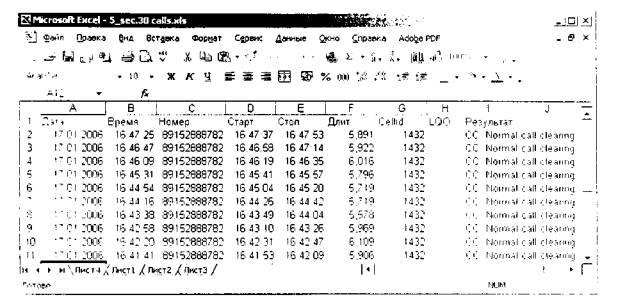 Рис.15 • Выделить данные в столбце "Длит." каждого файла-протокола Корунда и копировать "буфер обмена". После чего, последовательно вставлять их в соответствующие данной длительности соединения ячейки столбца "J" файла-формирователя протокола. Таким образом, должен быть заполнен вес столбец "J". Для сопоставления данных по дате и времени, также необходимо скопировать данные столбцов "Дата" и "Время" файлов-протоколов в соответствующие столбцы "Е" и "F" файла-формирователя протокола. • Открыть файл, полученный от биллинговой системы коммутатора для номера с которого производились исходящие вызовы программой Microsoft Excel (рис.16); Примечания 1 Если формат файла биллинговой системы отличен от формата электронных таблиц Excel (*.xls или *.csv), то в этом случае необходимо провести его преобразование в формат электронных таблиц. Например, исходный формат файла биллинговой системы имеет *.html, в этом случае необходимо просто переименовать его в *.xls. 2 При получении данных коммутатора с другим форматом данных (ячейки данных имеют другое расположение в столбцах, другой формат и т.д.) принцип и метод определения погрешности не изменяется.