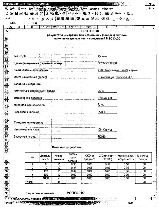 Рис.17 • При необходимости, необходимо удалить строки с неуспешными (блокированными) вызовами, а также строки, содержащие информацию о других услугах связи (на пример SMS); • В файле-формирователе протокола поверки будут рассчитаны значения всех статистических характеристик и вынесено решение о годности или негодности данного коммутатора. Протокол поверки находится на втором листе файла-формирователя протокола. (Рис. 18). • В случае, если сумма систематической и случайной составляющих погрешности будет <1 с, то "Результат испытаний" автоматически отображается как "УСПЕШНО", если будет >1 с, то "Результат испытаний" отображается как "НЕ УСПЕШНО";