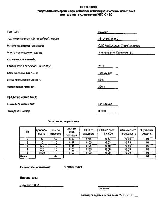 Введена с 2006-07-01 1 Область примененияНастоящая рекомендация устанавливает методы и средства первичной и периодической поверки систем измерения длительности соединений СИДС подсистем коммутации MSC и IN-платформ СПС сотовой подвижной связи стандарта GSM 900/1800 (далее - СИДС). Рекомендация предназначена для использования при поверке СИДС органами Государственной метрологической службы, поверителями ГНМЦ и метрологическими службами юридических лиц, аккредитованными в установленном порядке на право поверки средств измерений времени и частоты. При проведении поверки возможно использование одного из двух предлагаемых методов выполнения измерений: • локального, когда средство измерения и СИДС находятся рядом; • дистанционного, когда средство измерения и СИДС пространственно разнесены. Рекомендуемый межповерочный интервал периодической поверки СИДС - два года. 2 Нормативные ссылкиВ настоящей рекомендации использованы ссылки на следующие нормативные документы: ОСТ 45.147-99 Таксофоны. Общие технические требования; ПР 50.2.006-94 ГСИ. Порядок проведения поверки средств измерений. 3 Операции поверкиПри первичной и периодической поверке должны выполняться операции, указанные в таблице 1. Объектом метрологического контроля является система измерений длительности соединений (СИДС), входящая в состав подсистемы коммутации MSC и IN-платформ. Таблица 1