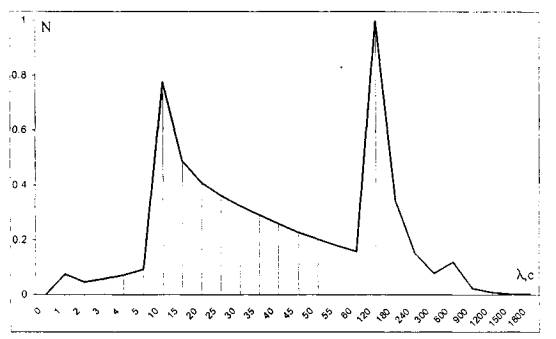 Рисунок А. Распределение зависимости времени телефонных соединений от их длительности, где: N - нормированное количество телефонных соединений; λ - длительность телефонного соединения, с. В соответствии с графиком, представленном на рисунке А, целесообразно взять несколько точек (длительностей соединений) для определения погрешности СИДС коммутатора. Точки с длительностью 10, 120 и 600 секунд выбираются из соображений максимумов кривой, для этих точек возьмем количество соединений равное 10. Для времени соединения 5 с. также возьмем N=10, а для времени соединения 1780 с. возьмем меньшее количество вызовов 4 из соображений того, что такой период длительности соединения имеет малую вероятность. Номенклатура исследуемых точек в диапазоне измерения и количество наблюдений в них приведены в таблице А. Таблица А.