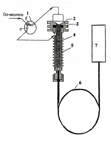 Pис. Схема устройства для проведения термодесорбции в испарителе хроматографа: 1 - трехходовый кран; 2 - дополнительная съемная крышка 3 - система уплотняющих колец; 4 - сорбционная трубка; 5 - корпус испарителя; 6 - хромотографическая колонка; 7 - детектор ПИД или ФИД. |