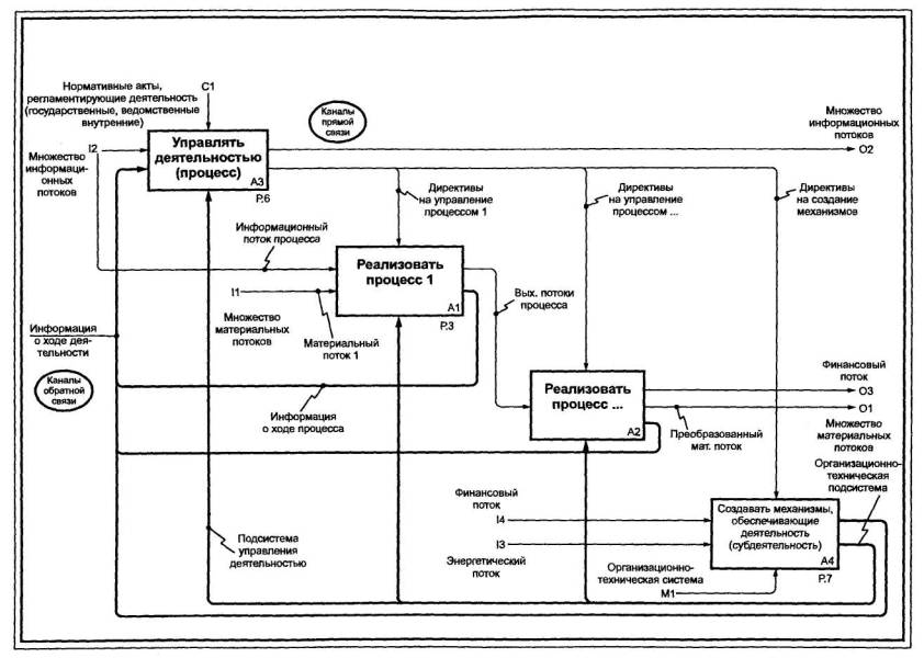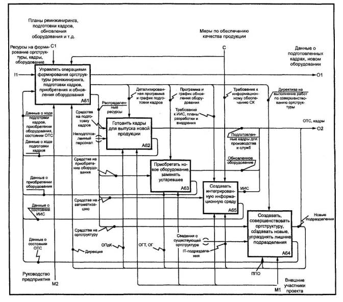 Организационно-техническая система - организационная структура, персонал и комплекс технических средств (оборудование), необходимые для осуществления деятельности. Организационно-техническая подсистема - часть организационно-технической системы, обеспечивающая протекание процесса (субдеятельности). Организационно-технический комплекс (модуль) - часть организационно-технической подсистемы, предназначенная для выполнения операции. Организационно-технический блок - часть организационно-технического комплекса, обеспечивающая выполнение действия. Таким образом, при корректном построении модели (без априорной привязки к «организации») появляется возможность связать ее блоки на разных уровнях декомпозиции с объектами организационно-технической структуры, выступающими в качестве механизмов. В этом случае организационно-техническая структура становится результатом функционального моделирования. Во многих моделях находит или должно находить отражение явление, состоящее в формировании или специфической настройке (перестройке) механизмов в ходе деятельности. Это явление часто именуется реинжинирингом производства и/или бизнес-процессов на предприятии (в организации). Явление отражается в модели как субдеятельность, поскольку почти всегда состоит из нескольких процессов. Укрупненная схема этой субдеятельности приведена на рисунке 40.
