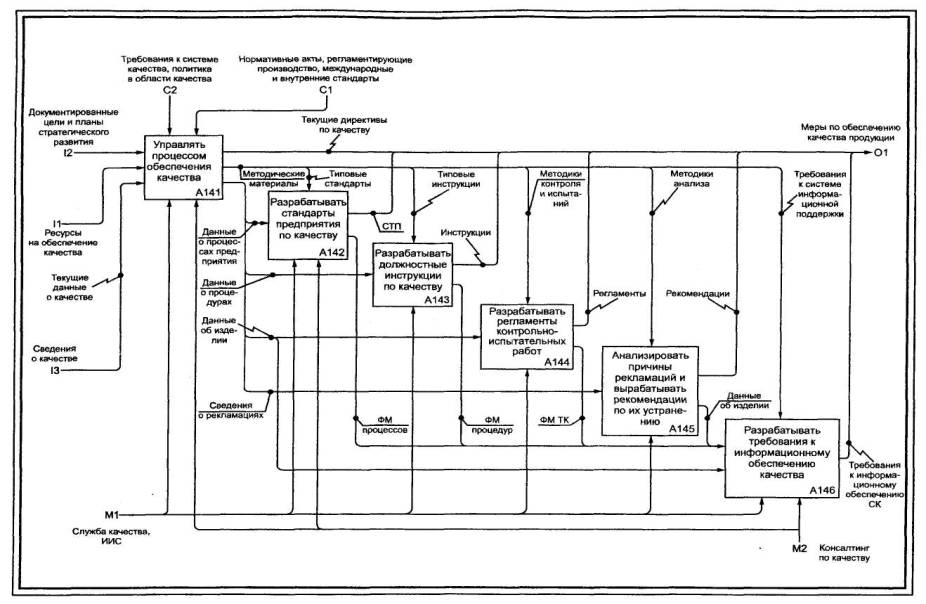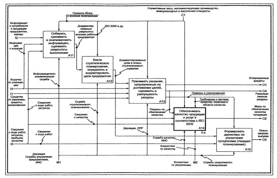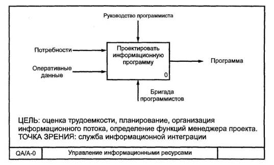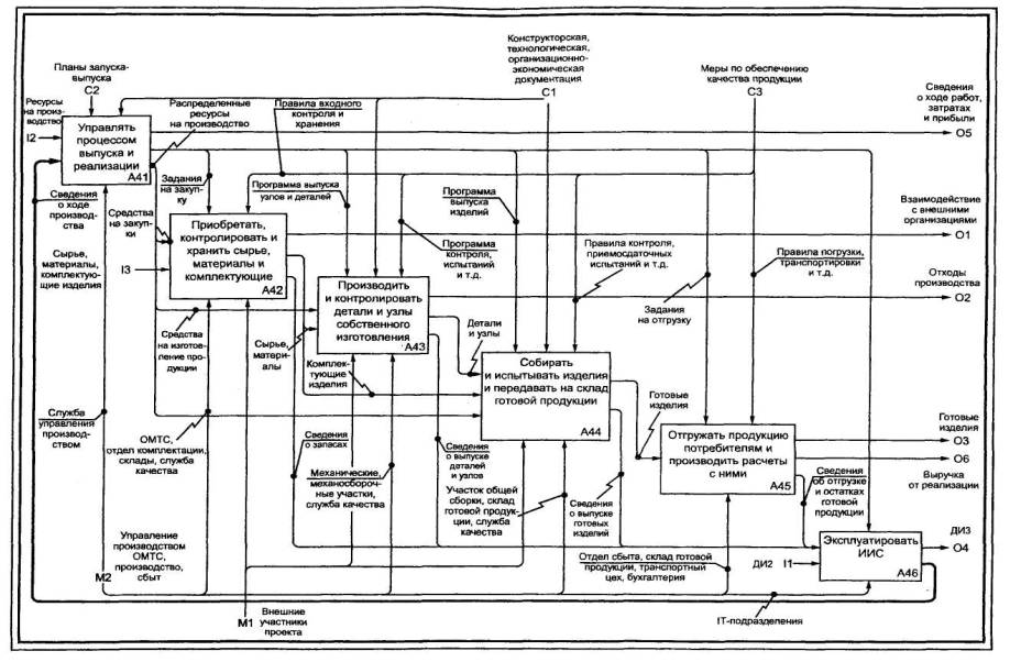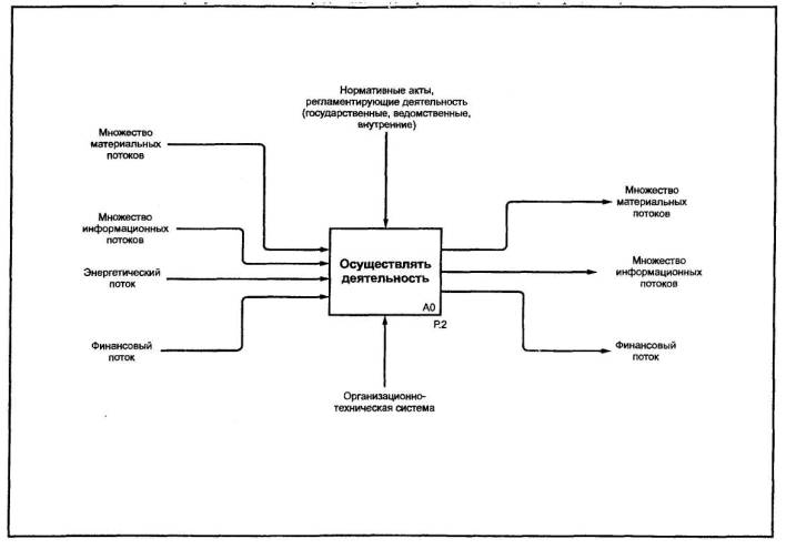 acquisition and life-cycle support. Дата введения 2002-07-011 Область примененияНастоящие рекомендации по стандартизации предназначены для использования при анализе и синтезе производственно-технических и организационно-экономических систем методами функционального моделирования в различных отраслях экономики. Рекомендации содержат описание комплекса средств для наглядного представления широкого спектра деловых, производственных и других процессов и операций предприятия на любом уровне детализации, а также организационные и методические приемы применения этих средств. 2 ОпределенияВ настоящих рекомендациях применяют следующие термины: 2.1 блок: Прямоугольник, содержащий имя и номер и используемый для описания функции. 2.2 ветвление: Разделение стрелки на два или большее число сегментов. Может означать «развязывание пучка» (см. 2.27). 2.3 внутренняя стрелка: Входная, управляющая или выходная стрелка, концы которой связывают источник и потребителя, являющиеся блоками одной диаграммы. Отличается от граничной стрелки. 2.4 входная стрелка: Класс стрелок, отображающих вход IDEF0-блока, то есть данные или материальные объекты, которые преобразуются функцией в выход. Входные стрелки связываются с левой стороной блока IDEF0. 2.5. выходная стрелка: Класс стрелок, отображающих выход IDEF0-блока, то есть данные или материальные объекты, произведенные функцией. Выходные стрелки связываются с правой стороной блока IDEF0. 2.6 глоссарий: Список определений для ключевых слов, фраз и аббревиатур, связанных с узлами, блоками, стрелками или с моделью IDEF0 в целом. 2.7. граничная стрелка: Стрелка, один из концов которой связан с источником или потребителем, а другой не присоединен ни к какому блоку на диаграмме. Отображает связь диаграммы с другими блоками системы и отличается от внутренней стрелки. 2.8 декомпозиция: Разделение моделируемой функции на функции-компоненты. 2.9 дерево узлов: Представление отношений между родительскими и дочерними узлами модели IDEF0 в форме древовидного графа. Имеет то же значение и содержание, что и перечень узлов (см. 2.23). 2.10 диаграмма А-0 (А минус ноль): Специальный вид (контекстной) диаграммы IDEF0, состоящей из одного блока, описывающего функцию верхнего уровня, ее входы, выходы, управление, и механизмы, вместе с формулировками цели модели и точки зрения, с которой строится модель. 2.11 диаграмма: Часть модели, описывающая декомпозицию блока. 2.12 диаграмма-иллюстрация (FEO): Графическое описание, используемое для сообщения специфических фактов о диаграмме IDEF0. При построении диаграмм FEO можно не придерживаться правил IDEF0. 2.13 дочерний блок: Блок на дочерней (порожденной) диаграмме. 2.14 дочерняя диаграмма: Диаграмма, детализирующая родительский (порождающий) блок. 2.15 имя блока: Глагол или глагольный оборот, помещенный внутри блока и описывающий моделируемую функцию. 2.16 интерфейс: Разделяющая граница, через которую проходят данные или материальные объекты; соединение между двумя или большим числом компонентов модели, передающее данные или материальные объекты от одного компонента к другому. 2.17 код ICOM (аббревиатура Input - вход, Control - управление, Output - выход, Mechanism - механизм): Код, обеспечивающий соответствие граничных стрелок дочерней диаграммы со стрелками родительского блока; используется для ссылок. 2.18 контекст: Окружающая среда, в которой действует функция