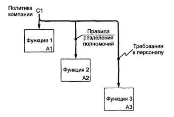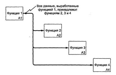 6.8 Текст и глоссарийДиаграмме может быть поставлен в соответствие структурированный текст, представляющий собой краткий комментарий к содержанию диаграммы. Текст используется для объяснений и уточнений характеристик, потоков, внутриблочньх соединений и т.д. Текст не должен использоваться для описания и без того понятных блоков и стрелок на диаграммах. При большом объеме текст располагается на отдельном листе модели (текстовой странице). Глоссарий предназначен для определения аббревиатур, ключевых слов и фраз, используемых в качестве имен и меток на диаграммах. Глоссарий определяет понятия и термины, которые должны быть одинаково понимаемы всеми участниками разработки и пользователями модели, чтобы правильно интерпретировать ее содержание. Глоссарий составляется с любой необходимой степенью подробности. 6.9 Диаграммы-иллюстрации (FEO)Эти диаграммы используются в качестве дополнений, поясняющих специфику содержания основных диаграмм в случаях, когда это необходимо. Диаграмма FEO не должна подчиняться синтаксическим правилам IDEF0. 7 Свойства диаграмм7.1 Стрелки как ограниченияСтрелки на диаграмме IDEF0, представляя данные или материальные объекты, одновременно задают своего рода ограничения (условия). Входные и управляющие стрелки блока, соединяющие его с другими блоками или внешней средой, описывают условия, которые должны быть выполнены для того, чтобы реализовалась функция, записанная в качестве имени блока. Рисунок 8 иллюстрирует случай, при котором «функция 3» может быть выполнена только после получения данных, выработанных «функцией 1» и «функцией 2».