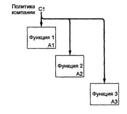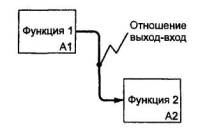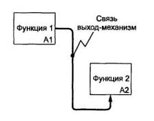 Рисунок 17 Связи «выход - механизм» (рисунок 18) отражают ситуацию, при которой выход одной функции становится средством достижения цели для другой. Связи «выход - механизм» возникают при отображении в модели процедур пополнения и распределения ресурсов, создания или подготовки средств для выполнения функций системы (например приобретение или изготовление требуемых инструментов и оборудования, обучение персонала, организация физического пространства, финансирование, закупка материалов и т.д.; подробнее - см. 11.3).