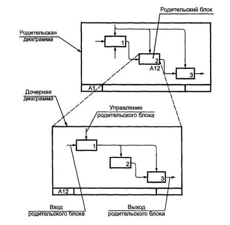 Рисунок 6 6.7 Родительская диаграммаРодительская диаграмма - та, которая содержит один или более родительских блоков. Иными словами, это диаграмма верхнего уровня, на которой располагается декомпозируемая функция со всеми ее связями. Каждая обычная (неконтекстная) диаграмма является также дочерней диаграммой, поскольку, по определению, она подробно описывает некоторый родительский блок. Таким образом, любая диаграмма может быть как родительской диаграммой (содержать родительские блоки), так и дочерней (подробно описывать собственный родительский блок). Аналогично, блок может быть как родительским (подробно описываться дочерней диаграммой), так и дочерним (появляющимся на дочерней диаграмме). Основное иерархическое отношение существует между родительским блоком и дочерней диаграммой, которая его подробно описывает (рисунок 6). То, что блок является дочерним и раскрывает содержание родительского блока на диаграмме предшествующего уровня, указывается специальным ссылочным кодом, написанным ниже правого нижнего угла блока. Этот ссылочный код может формироваться несколькими способами, из которых самый простой заключается в том, что код, начинающийся с буквы А (по имени диаграммы А-0), содержит цифры, определяемые номерами родительских блоков. Например показанные на рисунке 7 коды означают, что диаграмма является декомпозицией 1-го блока диаграммы, которая, в свою очередь, является декомпозицией 6-го блока диаграммы А0, а сами коды образуются присоединением номера блока.