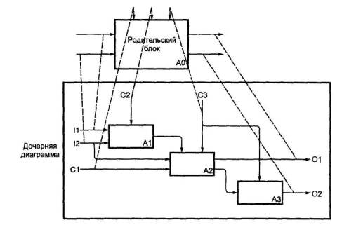 Рисунок 5 Контекстная диаграмма А-0 также должна содержать краткие утверждения, определяющие точку зрения должностного лица или подразделения, с позиций которого создается модель, и цель, для достижения которой ее разрабатывают. Эти утверждения помогают руководить разработкой модели и ввести этот процесс в определенные рамки. Точка зрения определяет, что и в каком разрезе можно увидеть в пределах контекста модели. Изменение точки зрения приводит к рассмотрению других аспектов объекта. Аспекты, важные с одной точки зрения, могут не появиться в модели, разрабатываемой с другой точки зрения на тот же самый объект. Формулировка цели выражает причину создания модели, то есть содержит перечень вопросов, на которые должна отвечать модель, что в значительной мере определяет ее структуру. Наиболее важные свойства объекта обычно выявляются на верхних уровнях иерархии; по мере декомпозиции функции верхнего уровня и разбиения ее на подфункции, эти свойства уточняются. Каждая подфункция, в свою очередь, декомпозируется на элементы следующего уровня, и так происходит до тех пор, пока не будет получена релевантная структура, позволяющая ответить на вопросы, сформулированные в цели моделирования. Каждая подфункция моделируется отдельным блоком. Каждый родительский блок подробно описывается дочерней диаграммой на более низком уровне. Все дочерние диаграммы должны быть в пределах области контекстной диаграммы верхнего уровня. 6.6 Дочерняя диаграммаЕдинственная функция, представленная на контекстной диаграмме верхнего уровня, может быть разложена на основные подфункции посредством создания дочерней диаграммы. В свою очередь, каждая из этих подфункций может быть разложена на составные части посредством создания дочерней диаграммы следующего, более низкого уровня, на которой некоторые или все функции также могут быть разложены на составные части. Каждая дочерняя диаграмма содержит дочерние блоки и стрелки, обеспечивающие дополнительную детализацию родительского блока. Дочерняя диаграмма, создаваемая при декомпозиции, охватывает ту же область, что и родительский блок, но описывает ее более подробно. Таким образом, дочерняя диаграмма как бы вложена в свой родительский блок. Эта структура иллюстрируется рисунком 6.