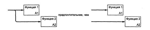 Рисунок 24 9 Правила построения диаграммПри построении диаграмм необходимо выполнять следующие правила. 1 В составе модели должна присутствовать контекстная диаграмма А-0, которая содержит только один блок. Номер единственного блока на контекстной диаграмме А-0 должен быть 0. 2 Блоки на диаграмме должны располагаться по диагонали - от левого верхнего до правого нижнего угла диаграммы в порядке присвоенных номеров. Блоки на диаграмме, расположенные вверху слева, «доминируют» над блоками, расположенными внизу справа. «Доминирование» понимается как влияние, которое блок оказывает на другие блоки диаграммы. Расположение блоков на листе диаграммы отражает авторское понимание доминирования. Таким образом, топология диаграммы показывает, какие функции оказывают большее влияние на остальные. При параллельном функционировании блоков отношение доминирования часто носит формальный характер, и диагональное расположение блоков лишь способствует читаемости диаграммы. 3 Диаграммы (кроме диаграммы А-0) должны содержать не менее трех и не более шести блоков. Эти ограничения поддерживают сложность диаграмм на уровне, доступном для чтения, понимания и использования. Диаграммы с количеством блоков менее трех вызывают серьезные сомнения в необходимости декомпозиции родительской функции. Диаграммы с количеством блоков более шести сложны для восприятия читателями и вызывают у автора трудности при внесении в нее всех необходимых графических объектов и меток. 4 Каждый блок неконтекстной диаграммы получает номер, помещаемый в правом нижнем углу; порядок нумерации - от верхнего левого к нижнему правому блоку (от 1 до 6). 5 Каждый блок, подвергнутый декомпозиции, должен иметь ссылку на дочернюю диаграмму; ссылка (например узловой номер, С-номер или номер страницы) помещается под правым нижним углом блока. 6 Имена блоков (выполняемых функций) и метки стрелок должны быть уникальными. Если метки стрелок совпадают, это значит, что стрелки отображают тождественные данные. 7 При наличии стрелок со сложной топологией целесообразно повторить метку для удобства ее идентификации. 8 Следует обеспечить максимальное расстояние между блоками и поворотами стрелок, а также между блоками и пересечениями стрелок для облегчения чтения диаграммы. Одновременно уменьшается вероятность того, что две разные стрелки будут перепутаны. 9 Блоки всегда должны иметь хотя бы одну управляющую и одну входную стрелку, но могут не иметь выходных стрелок. 10 Если одни и те же данные служат и для управления, и для входа, вычерчивается только стрелка управления. Этим подчеркивается управляющий характер данных и уменьшается сложность диаграммы. 11 Максимально увеличенное расстояние между параллельными стрелками облегчает размещения меток, их чтение и позволяет проследить пути стрелок (рисунок 25).