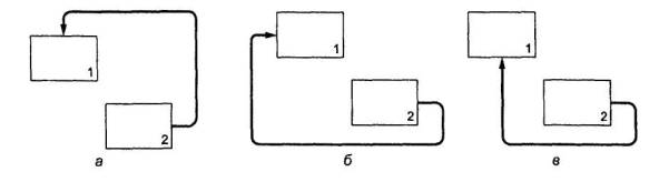 Рисунок 27 Обратные связи по входу должны быть показаны как «вниз и под» (рисунок 27б). Так же показываются обратные связи посредством механизма (рисунок 27в). Таким образом обеспечивается показ обратной связи при минимальном числе линий и пересечений. 14 Циклические обратные связи для одного и того же блока изображаются только для того, чтобы их выделить. Обычно обратную связь изображают на диаграмме, декомпозирующей блок. Однако иногда требуется выделить повторно используемые объекты (рисунок 28).