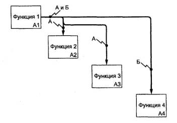 Рисунок 8 7.2 Параллельное функционированиеРазличные функции в модели могут быть выполнены параллельно, если удовлетворяются необходимые ограничения (условия). Как показано на рисунке 9, один блок может создать данные (а) или материальные объекты (б), необходимые для параллельной работы нескольких блоков.