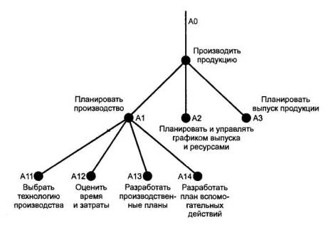 Узловой номер используется также для обозначения того, что блок подвергнут декомпозиции. В этом случае узловой номер, совпадающий с номером дочерней диаграммы, помещается под правым нижним углом блока на родительской диаграмме (рисунок 36). 10.3 Перечень узловПеречень узлов представляет информацию о входящих в модель узлах в форме списка, напоминающего обычное оглавление и отражающего иерархическую структуру модели, как показано на рисунке 36. А0 Производить продукт А1 Планировать производство А11 Выбрать технологию производства А12 Оценить требуемое время и затраты на производство А13 Разработать производственные планы АН Разработать план вспомогательных действий А2 Разрабатывать и управлять графиком выпуска и ресурсами А21 Разработать основной график А22 Разработать график координации работ А23 Оценивать затраты и приобретать ресурсы А24 Следить за выполнением графика и расходом ресурсов A3 Планировать выпуск продукции Рисунок 36 10.4 Дерево узловРазработанная модель IDEF0 со всеми уровнями структурной декомпозицией может быть представлена на единственной диаграмме в виде дерева узлов, дополняющего перечень узлов. Для изображения этого дерева нет стандартного формата. Единственное требование состоит в том, что вся иерархия узлов модели должна быть представлена наглядно и понятно. Пример дерева узлов показан на рисунке 37.