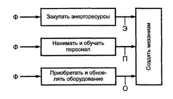 Э - энергия, П - персонал, О - оборудование, Ф - финансы Рисунок 40 Согласно схеме входом и одновременно потребляемым ресурсом субдеятельности являются финансы, преобразуемые в другие виды ресурсов - энергетические, трудовые, материальные (оборудование, вспомогательные материалы и т.д.). (см. приложение Б). Механизм любого уровня обеспечивает выполнение деятельности (процесса, операции, действия), потребляя ресурсы: финансовые, энергетические, трудовые, непосредственно или с помощью промежуточных преобразований (рисунок 40), то есть специфических процессов, которые можно назвать поддерживающими, обеспечивающими или вспомогательными (по аналогии с вспомогательными производствами, цехами, участками на машиностроительном предприятии) по отношению к основным процессам, где происходят преобразования, однозначно обусловленные целью деятельности. Существенный признак вспомогательного процесса: этот процесс не создает конечного продукта деятельности и, следовательно, прибыли. 11.4 Управление - особый вид процесса, операции, действияОдин из общих принципов методологии IDEF0 требует, чтобы к каждому блоку на диаграмме была присоединена хотя бы одна управляющая стрелка, отображающая условия правильного функционирования блока (см. раздел 9). Ниже сформулирован ряд определений и методических положений, которыми следует руководствоваться при отражении управлений на функциональных моделях. Управление деятельностью - процесс, состоящий как минимум из следующих операций: - формулирование целей деятельности; - оценивание ресурсов, необходимых для осуществления деятельности и их сопоставление с имеющимися ресурсами; - сбор информации об условиях протекания и фактическом состоянии деятельности («глобальная» обратная связь); - выработка и принятие решений, направленных на достижение целей, в частности, решений о распределении ресурсов по процессам, входящим в состав деятельности; оформление решений в виде директив на управление процессами; - реализация решений (исполнение директив) и оценка их результатов («локальная обратная связь»); - корректировка (в случае необходимости, например при нехватке ресурсов) ранее сформулированных целей (самонастройка, адаптация). Управление процессом - операция, состоящая как минимум из следующих действий: - анализ директивы на управление процессом, ее декомпозиция на директивы управления операциями; - сбор (прием по каналам связи) информации о ходе выполнения операций, ее обобщение и формирование сведений о состоянии процесса; передача данных в подсистему управления деятельностью; - сопоставление информации о ходе операций с данными директив и выработка локальных решений, направленных на устранение отклонений; - корректировка (в случае необходимости) директив на выполнение операций. Управление операцией - действие, состоящее в выработке на основании директивы на управление операцией команд на управление действиями, в реализации этих команд, оценке результатов выполнения, передаче необходимой информации в комплекс управления процессом, корректировке команд в случае необходимости. Блоки управления должны присутствовать на каждой IDEF0-диаграмме (кроме тех, которые являются декомпозициями самих таких блоков). Через них осуществляются управляющие воздействия на остальные блоки диаграммы. Именно эт
