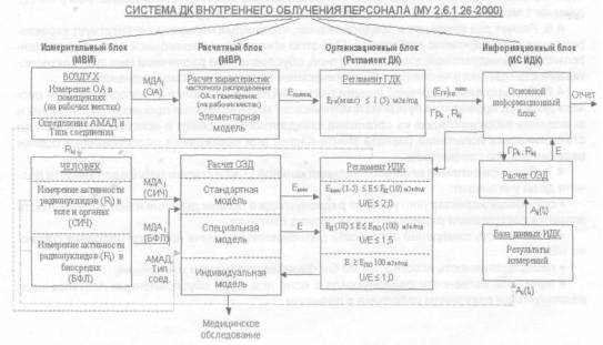 Как видно из рисунка, система ДК внутреннего облучения персонала состоит из 4-х частей - измерительной, расчетной, организационной, информационной и 2-х уровней - группового дозиметрического контроля (ГДК), осуществляющего контроль доз по результатам измерений загрязнения воздуха помещений (рабочих мест), и индивидуального дозиметрического контроля (ИДК), осуществляющего контроль доз по результатам измерений активности радионуклидов в человеке. В свою очередь ИДК делится на 3 подуровня - «стандартный», «специальный» и «индивидуальный». Разбиение на уровни и подуровни служит для оптимизации затрат на определение величины индивидуальной дозы. Последовательность действий по определению индивидуальных доз персонала отражается в Регламенте ДК. Расчетная часть позволяет связать измеряемые величины (обеспечиваемые измерительной частью) с результирующей индивидуальной ОЭД. Она позволяет решать задачу оптимизации системы ДК исходя из возможностей имеющейся в наличии измерительной части и системой установленных допустимых уровней и неопределенностей оценки индивидуальных доз, являясь, таким образом, инструментом для разработки Регламента ДК внутреннего облучения персонала предприятия. Стандартная модель определения индивидуальных доз в системе ДК внутреннего облучения персонала является базовой моделью расчета, достаточной для разработки Регламента ИДК. 4.2. Стандартная модель, согласно МУ 2.6.1.16-2000 (п. 10.1), используется в рамках ИДК персонала в контролируемых условиях (НРБ-99, п. 3), когда значение индивидуальной дозы (полученное с использованием стандартной модели) не превышает уровня действия (УД). 4.3. Стандартная модель включает: • определение индивидуальных доз облучения по результатам индивидуальных систематических измерений активности радионуклидов в моче или кале человека; • распространение на объект контроля стандартных условий облучения. 4.4. Стандартные условия облучения характеризуются следующими параметрами: • объемом вдыхаемого воздуха, с которым радионуклид может поступить в органы дыхания персонала группы А на протяжении календарного года: VПЕРС = 2,4 · 103 м3; • классификацией дисперсной фазы радиоактивного аэрозоля по скорости перехода радионуклида из легких в кровь согласно п. 8.3 НРБ-99 и распределением химических соединений элементов по типам при ингаляции согласно приложению П-3 к НРБ-99. • логарифмически нормальным распределением активности по размерам частиц дисперсной фазы аэрозоля с активностным медианным аэродинамическим диаметром (АМАД), равным 1 мкм и стандартным геометрическим отклонением, равным 2,5. 4.5. Расчет доз проводят в предположении, что каждый человек соответствует характеристикам стандартного работника. При этом игнорируется возможное отличие действительной индивидуальной дозы от расчетной, обусловленное различием между характеристиками стандартного человека и биологическими характеристиками индивида. 4.6. Определение величины индивидуальной ОЭД (Е) и оценка неопределенности расчета дозы (U) проводится путем математического моделирования процесса поступления и выведения радионуклидов из организма стандартного человека и использования метода статистических испытаний (метода Монте-Карло) для нахождения распределения оценок величин Е и его параметров. 4.7. При определени