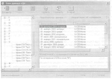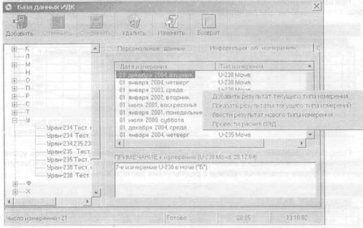 Операции с электронной базой данных ИДК осуществляются при помощи: • кнопок, расположенных в верхней части формы; • алфавита, отображенного в левом окне с помощью «дерева» (если в базе данных имеется объект (человек) с фамилией, начинающейся с определенной буквы, значок [+] информирует об этом); • вызова соответствующих таблиц (Персональные данные, Информация об измерениях). База данных ИДК первоначально содержит тестовые примеры на все радионуклиды, на которые программа позволяет проводить расчеты индивидуальных ожидаемых эффективных доз облучения работников (о чем программа информирует значком [+] в левом окне). 3. Для вызова данных и проведения расчетов необходимо выбрать объект (человека), нажав указателем мыши на соответствующий [+] и соответствующий объект (фамилию). После этого нажать указателем мыши на вкладку «Информация об измерениях» - появится таблица, отображающая даты измерений и тип измерения. Далее поместить указатель мыши на соответствующую дату (тип) измерения и нажать на правую кнопку - появится меню, позволяющее выбрать 4 операции (см. рисунок):