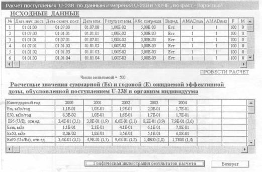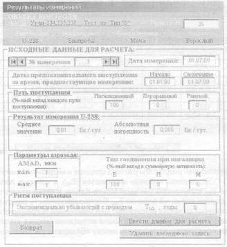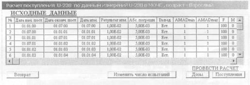 Программа позволяет проводить расчет «Дозы» и «Поступления» (для изотопов урана поступление рассчитывается в миллиграммах). При нажатии кнопки «Дозы» (или «Поступления») на форме появляется таблица с результатами расчета дозы (поступления):