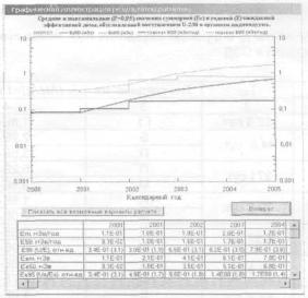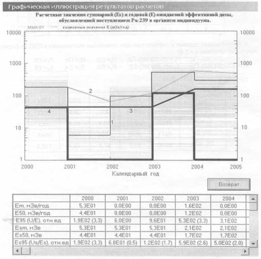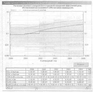 В таблице представлены результаты расчета средних и медианных значений суммарной (Es) и годовой (Е) ОЭД, верхние границы интервалов (Е95), в которые попадают 95 % результатов расчетов EiN, полученных методом Монте-Карло, а также относительная неопределенность (U/E) оценки значений величин Е50. Воспроизводимость результатов (статистических) расчетов зависит от числа испытаний. Для изменения погрешности расчета (Es) и (Е) предусмотрена возможность изменения числа испытаний (кнопка «Изменить число испытаний»), которая появляется, если нажать кнопку «Возврат», расположенную под таблицей результатов расчета. При нажатии кнопки «Графическая иллюстрация результатов расчета» появляется форма, которая позволяет увидеть следующие результаты расчета в графическом изображении: • среднее («наилучшее») значение ОЭД за каждый календарный год - годовая Е50 (мЗв/год); • среднее («наилучшее») значение суммарной ОЭД на окончание каждого календарного года - Es50 (мЗв); • верхнюю границу 95 %-го интервала частотного распределения годовых (Е95) и суммарных (Es95) ОЭД (мЗв).