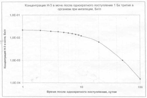 *) Рекомендуемые в данной методике значения дозовых коэффициентов для соединений урана UO2, U3O8 [7, 8]. Тритий Функция выведения Н-3 с мочой при ингаляции паров тритированной воды (концентрация Н-3 в моче после однократного поступления 1 Бк трития в организм при ингаляции), Бк/л.