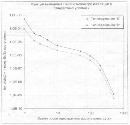 Значения параметров случайной переменной f: xg = 1; σg = 1,5. Железо Функции выведения Fe-59 с мочой при ингаляции в стандартных условиях