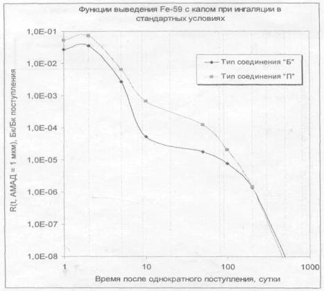 Значения параметров случайной переменной f: xg = 1; σg = 1,5. Функции выведения Fe-59 с калом при ингаляции в стандартных условиях