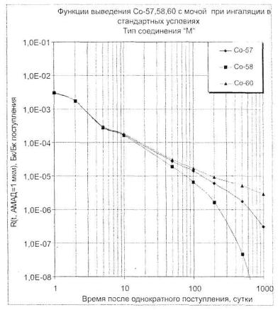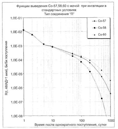 Значения параметров случайной переменной f: xg = 1; σg = 2,0. Кобальт Функции выведения Со-57, 58, 60 с мочой при ингаляции в стандартных условиях