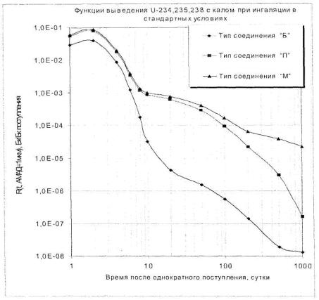 Функции выведения U-234, 235, 238 с калом при ингаляции в стандартных условиях
