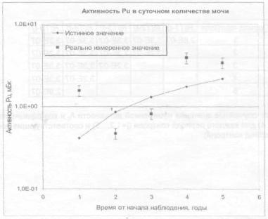 Однако в действительности, даже если человек, полностью соответствует средним параметрам (выведения), при определении радионуклида в моче имеются две составляющие неопределенности: 1. Статистическая погрешность определения активности радионуклида в измеряемом образце. 2. Неопределенность, связанная с биологической вариабельностью выведения радионуклида с мочой. Результатом этих неопределенностей является то, что в приведенном примере ингаляционного поступления плутония реальные результаты измерений плутония в моче человека (соответствующего средним параметрам выведения) будут заметно отличаться от точных значений, например, они будут такими как показано на рисунке 1: