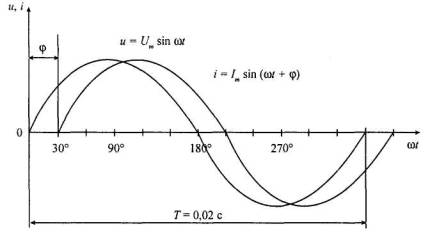 Рис. 1. Мгновенные значения тока и напряжения с углом сдвига фаз φ